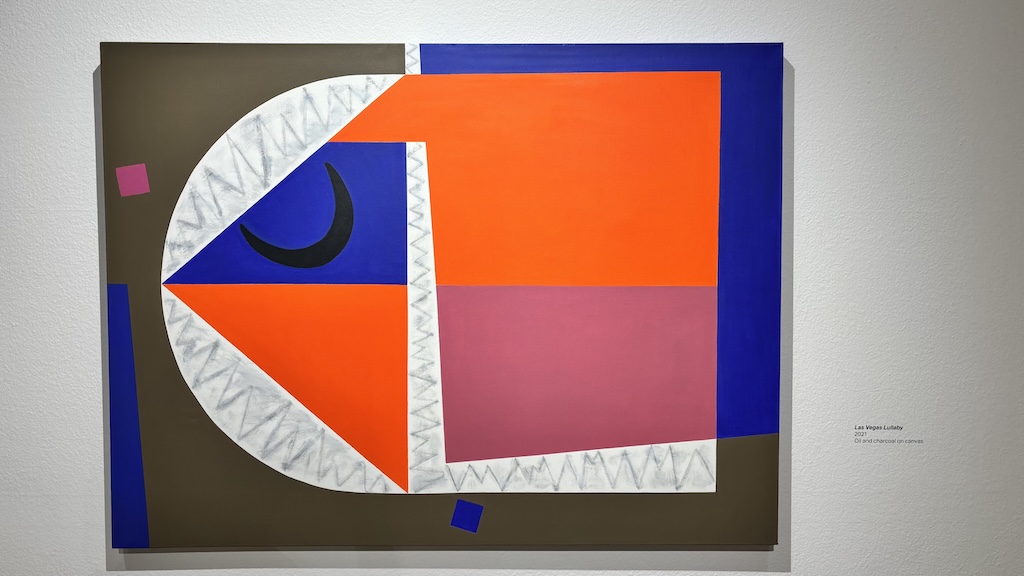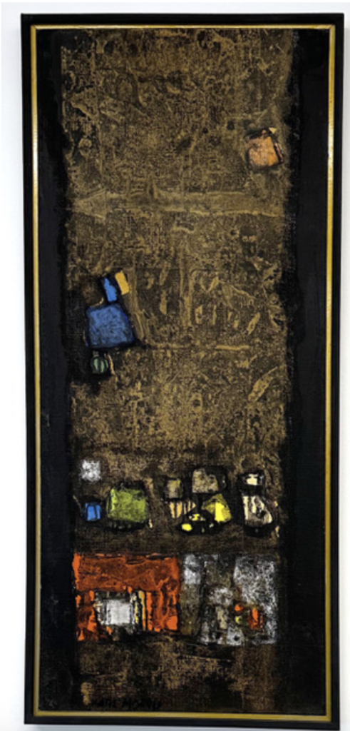 Nancy Lindburg’s Still Life in Flux (2014) presents layered geometric forms in vibrant oranges, blues, and deep neutrals, creating a sense of movement within abstraction. Carl Morris’s Dwelling (1965) offers a vertical composition grounded in earthy browns and textured surfaces, punctuated by small bursts of color. Louis Bunce’s View (1973) introduces architectural structure and rhythmic pattern, balancing a vivid green plane with repeated arch-like motifs and a distant horizon.