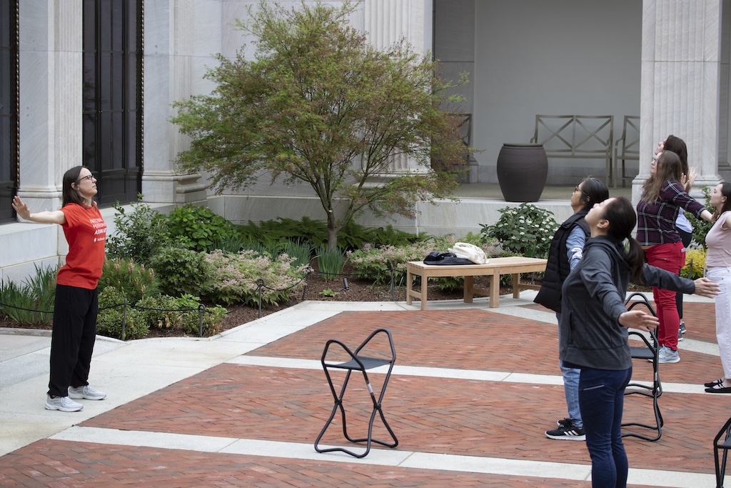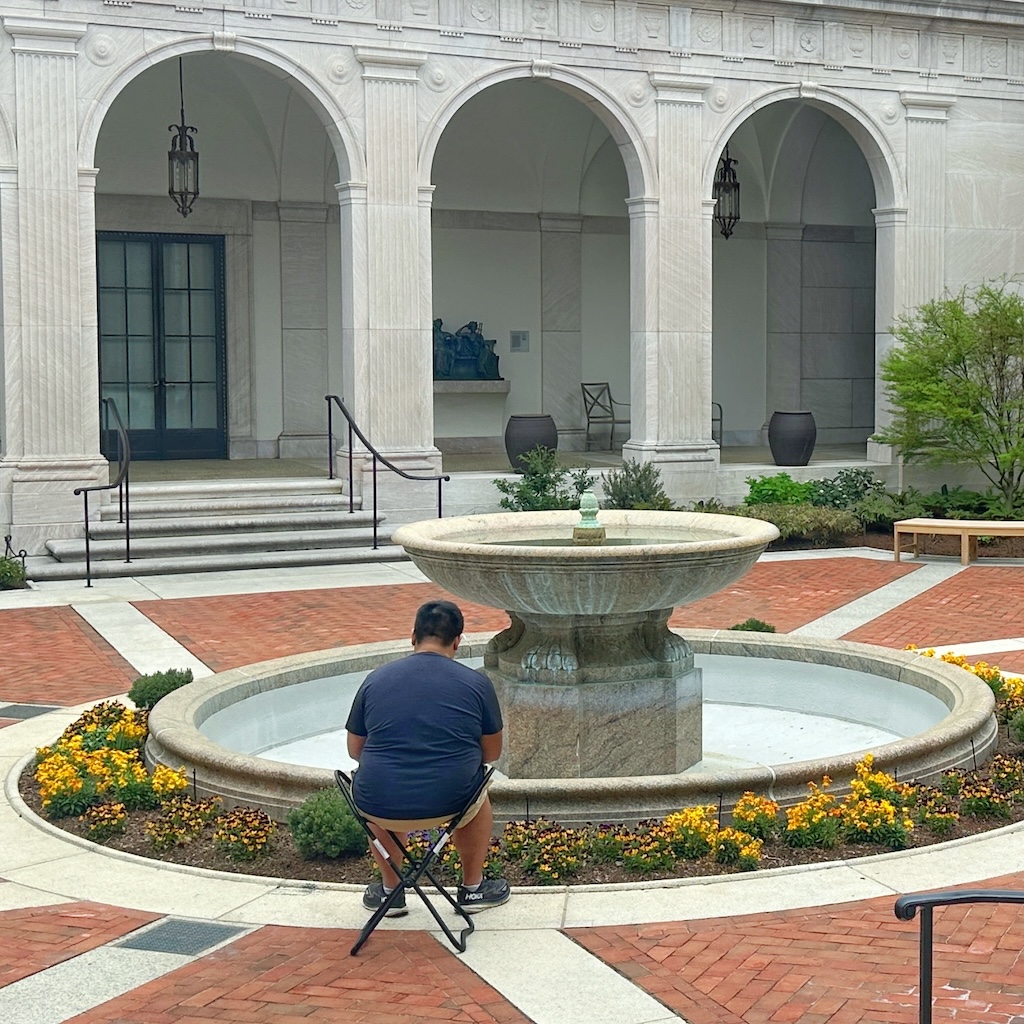 In the museum’s outdoor courtyard, 24 visitors joined Forest Bathing sessions led by a certified forest therapy guide. Though not a traditional forest setting, the courtyard’s Japanese maples, ferns, holly, pine, peonies, birds, bees, and even beetles became focal points for sensory awareness. Participants were invited to gently touch plants — an uncommon freedom in a museum environment — and to slow down through guided sensory exercises.