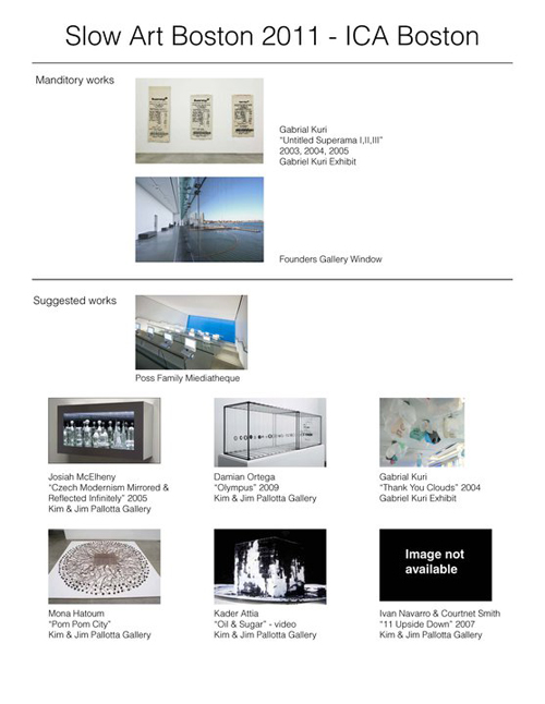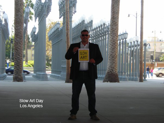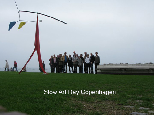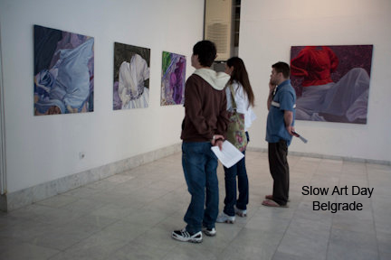 Slow Art Day is a worldwide shared experience where on the same day every year small groups of people gather to visit an art museum or gallery in their city or town. Instead of the usual few seconds of looking at a piece of art, Slow Art Day participants spend 10 to 15 minutes or longer viewing each piece of five or more art works that were chosen by volunteer hosts. The participants simply view art on their own, without a docent or art historian to fill them in, thereby experiencing their own thoughts, feelings and insights. Participants can look at the art, sketch, journal, meditate, or what ever works for them (as allowed) to get to know the art. Then after viewing everyone gathers for an informal lunch and discusses their experiences of slow art.