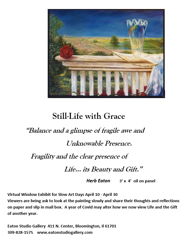 For their second Slow Art Day, The Eaton Gallery in Bloomington, Illinois, organized a “drive-by” exhibit in the Gallery’s window display, inviting the local community to slow down and enjoy floral still-life paintings by local artist Herb Eaton.