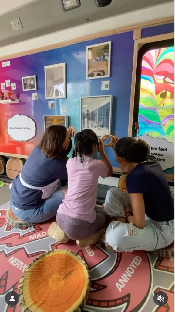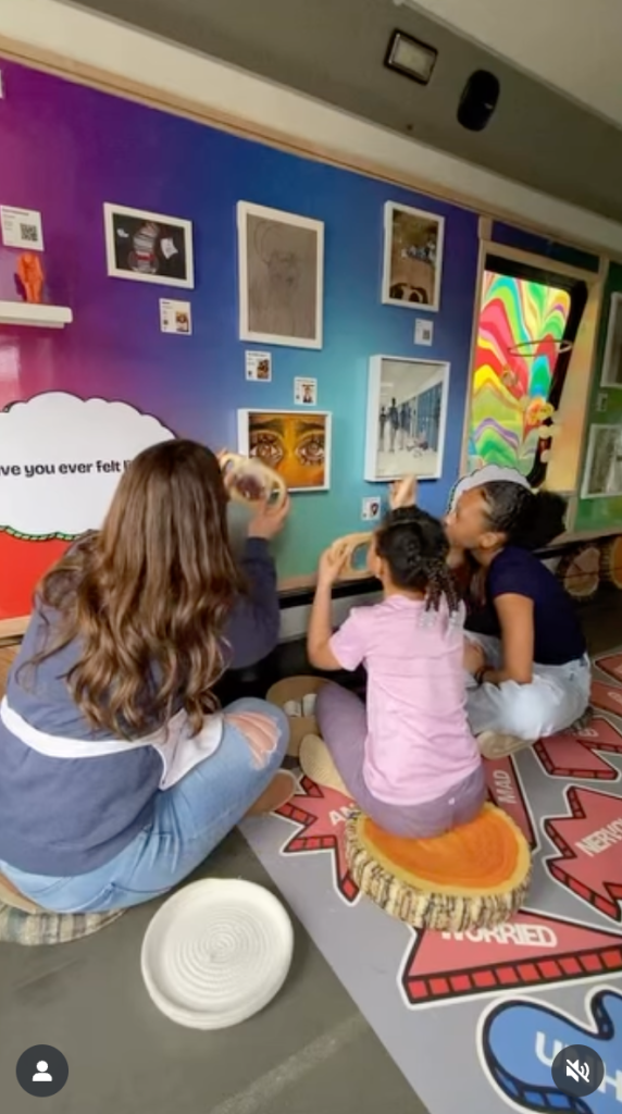 Two cARTie kids look closely at two works of art inside cARTie with different tools and from different angles, with a cARTIe educator. Screenshot from cARTie’s Instagram.Two cARTie kids look closely at two works of art inside cARTie with different tools and from different angles, with a cARTIe educator. Screenshot from cARTie’s Instagram.