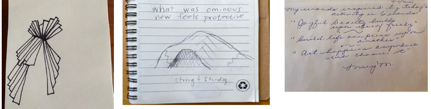 After looking slowly at the sculpture for 7-10 minutes, participants were invited to share and discuss their observations using the following questions and creative prompts: